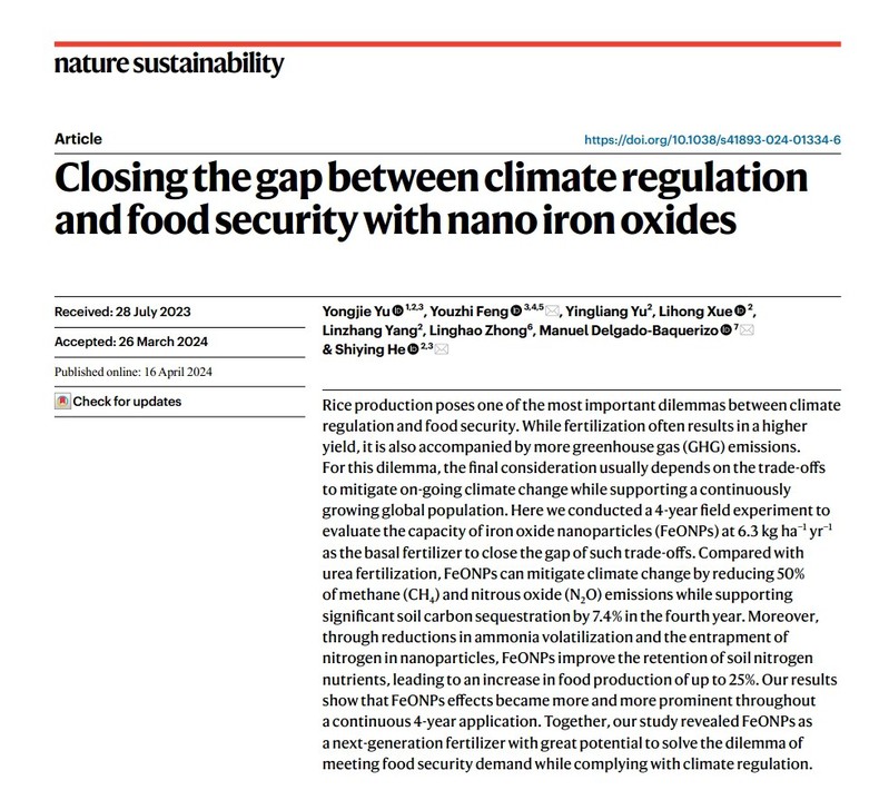 纳米材料因其特殊的性能和广泛的用途,在未来气候智慧型农业中的应用带来了机遇与挑战。进行为期4年的纳米赋能稻田试验,综合分析纳米铁肥作用下植株、产量、土壤和温室气体等指标及其生物学机制,阐明其全生命周期的生态和经济效益(Nature Sustainability,第一作者,2024),(Environmental Pollution,第一作者,2023),Frontiers in Microbiology(通讯作者,2021)和应用与环境生物学报(通讯作者,2020)。后续研究获得国自然面上项目“电活性微生物关键类群调控纳米铁介导稻田固碳减排的过程与机制”(42477305)、常州市科技局“龙城英才计划”第四批领军型创新人才引进等项目资助。