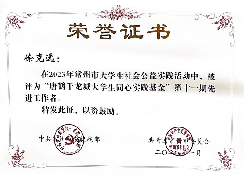 他先后与新疆阿勒泰清河县牧业寄宿学校等政校行企单位共建实践育人基地20余个,开展“红色溯源,寻找铁军精神融入和美乡村建设的金钥匙”等大型社会实践活动56项1200余次,累计服务时长2.4万小时,受益群众达1.5万余人次。荣获江苏省大中专学生志愿者暑期文化科技卫生“三下乡”社会实践活动先进工作者2次。指导6个团队入选团中央全国大学生“两弹一星”精神志愿宣讲等实践团队,获评江苏省优秀七彩志愿服务队等荣誉称号。