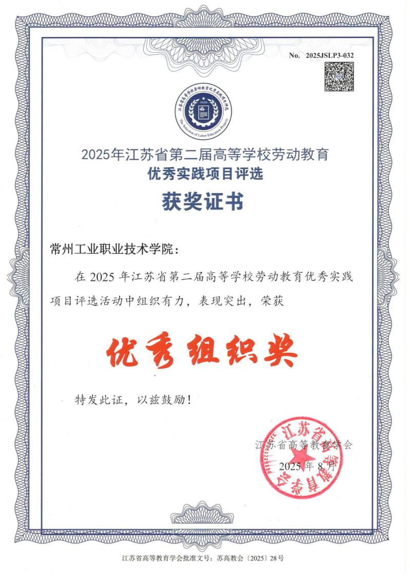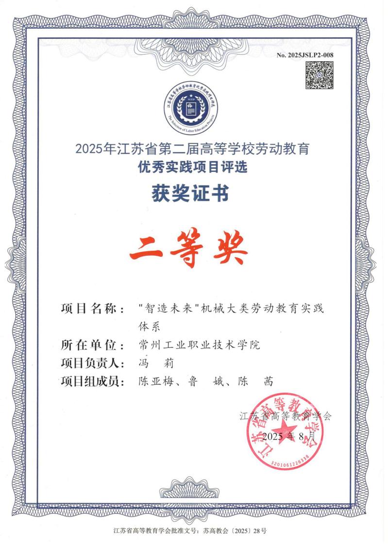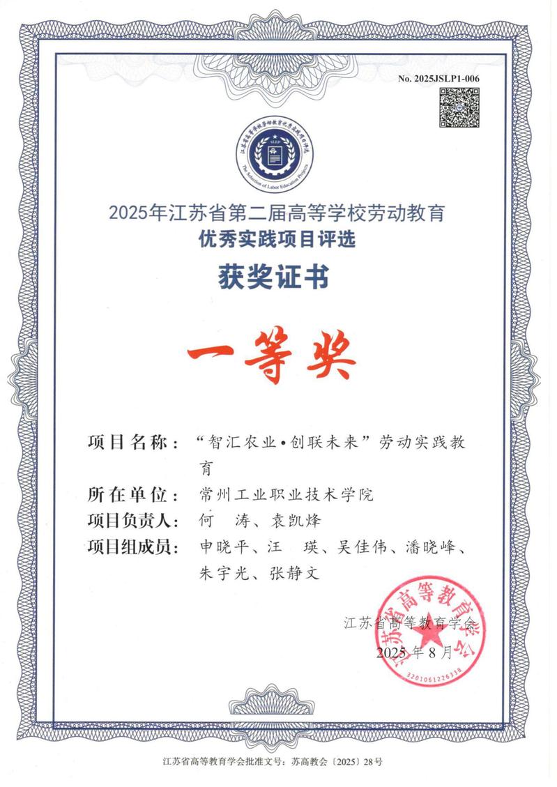近日,江苏省高等教育学会2025年高等学校劳动教育优秀实践项目评选结果出炉,我校信息工程学院何涛、袁凯烽,智能控制学院夷文玉、蒋金伟的项目获一等奖,机械与交通学院冯莉的项目获二等奖。同时,我校荣获江苏省第二届高等学校劳动教育优秀实践项目评选活动优秀组织奖。